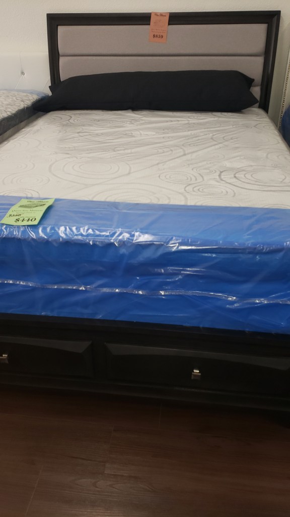 Twin size metal bed with blue pillow top 8″ mattress included.